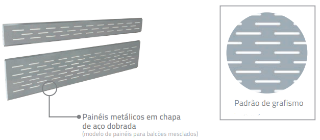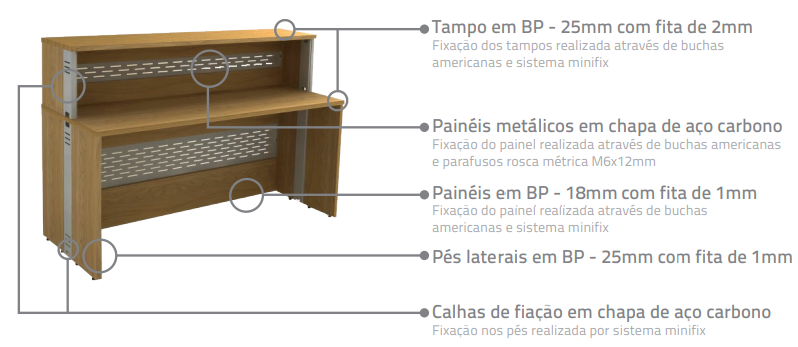 Tampo confeccionado em BP 25mm com fita borda 2mm; frontais superior e inferior em BP 18mm com fita borda 1mm e painel central em aço; pés em BP 25mm com fita borda 1mm; pés com niveladores de altura; calha com subida de fiação em aço.