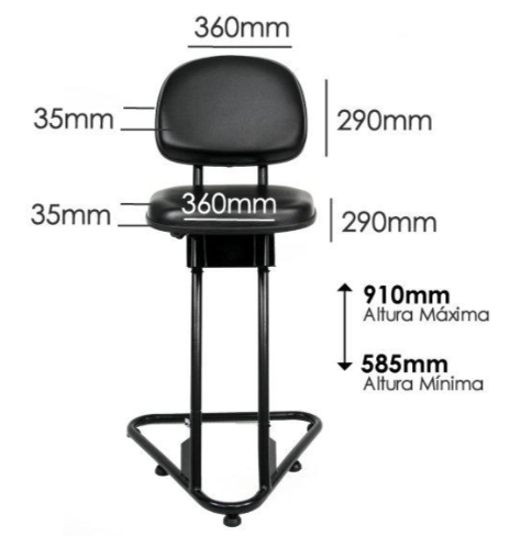 Banco semi-sentado com estrutura em aço pintado preto, encosto de 38x23 cm com espuma de 30 mm, assento redondo Ø320 mm com espuma de 40 mm, altura total de 1015 mm, regulagem de assento de 485 a 810 mm. Assento e encosto revestidos em couro ecológico (sintético).