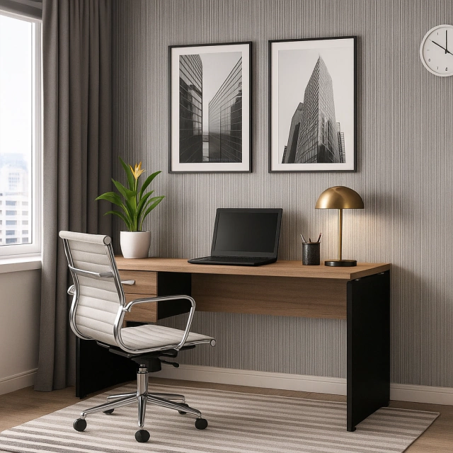 Mesa reta pé painel Naturalle/Preto, com gaveteiro 2 gavetas