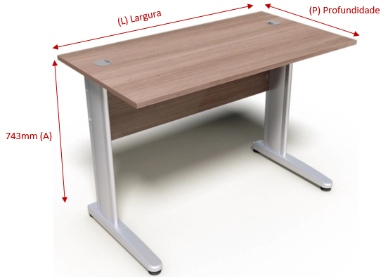 Mesa retangular, tampo 18 mm, acabamento fita 1 mm, com 2 passa fios, travessa em madeira, pés de aço com calha para subida de fiação, base repuxada, pés com sapatas niveladoras de acordo com o nível do piso. SEM GAVETAS.
