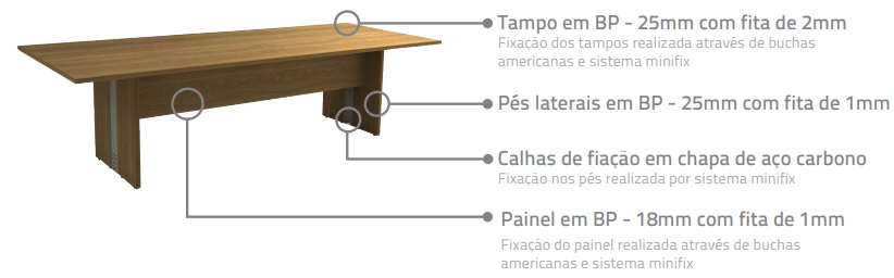 Mesa de Reunião retangular: tampo confeccionado em MDPBP 25mm com fita de borda 2mm; saia / frontal em MDP 18mm; pés em bp 25mm fita de 1mm, com calha para subida de fição; pés com niveladores de altura. Com sapatas niveladoras de acordo com o nivel do piso. Com 1 caixa de tomada