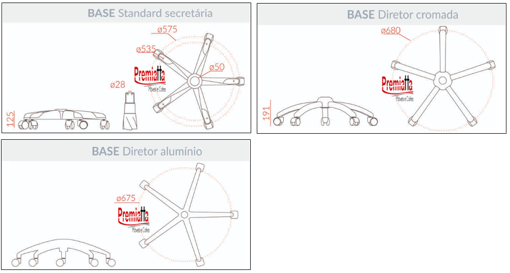 Base: Aluminio, Piramidal, cromada ou Standard;aço com capa em polipropileno.