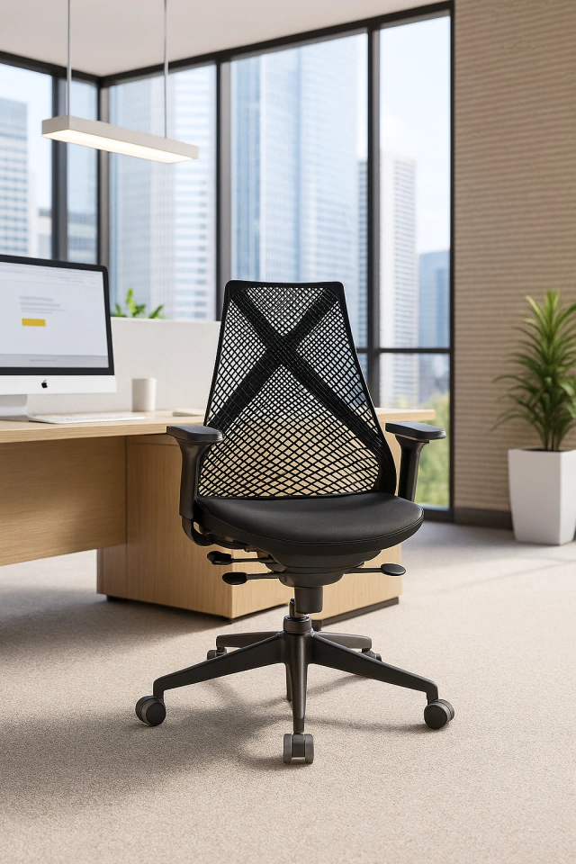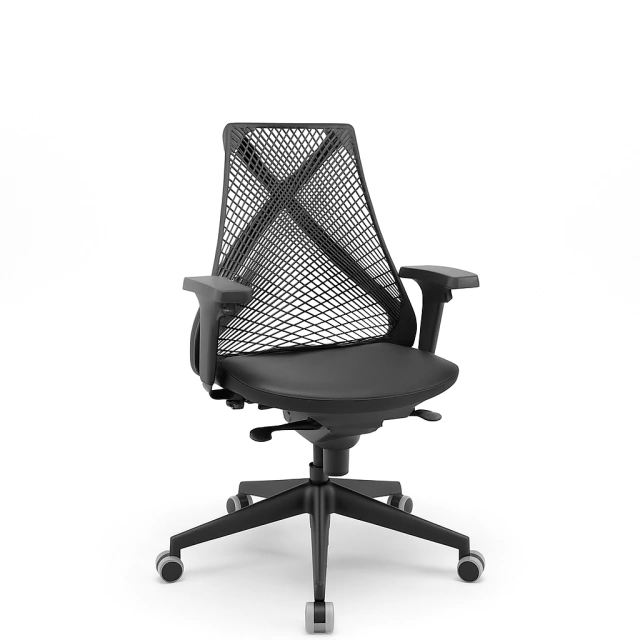 Poltrona X presidente, assento estofado revestido em courvin cor preta com sistema de regulagem para frente ou recuo, encosto com ajuste de inclinação com travamento em varias possições, base italia giratoria em aço com acabamento em polipropileno com ajuste de altura, mecanismo sincronizado com inclinação do assento e encosto rodizios em PU (ANTI-RISCO no piso). Braços com ajuste de altura e largura. Com 12 meses de Garantia contra defeito de fabricação. Suporte de peso até 110kg.