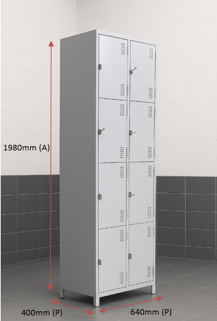Roupeiro de aço 8 portas pequenas, pitão para cadeado, sapatas fixas protedoras nos pés. PMCCM48