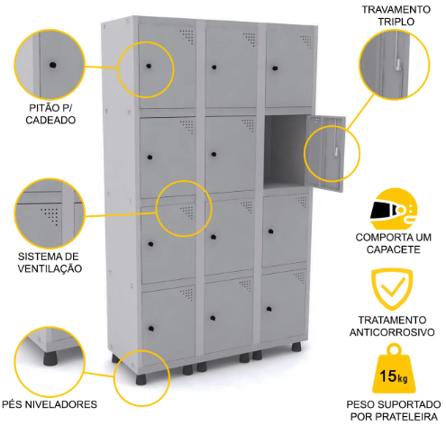 Ideal para vestiarios, academias, guarada volumes, escolas, setores produtivos, dentre outros ambientes.